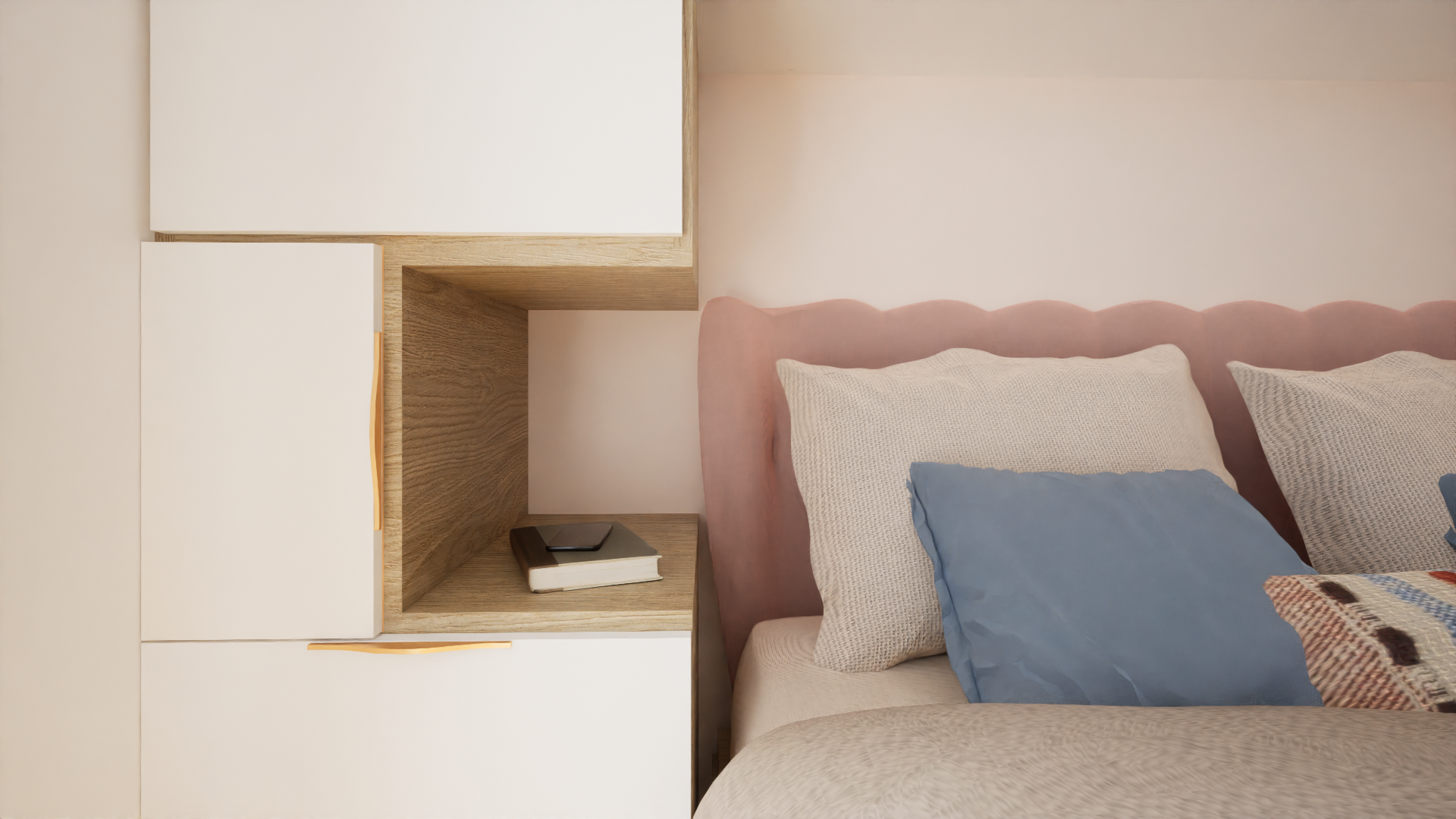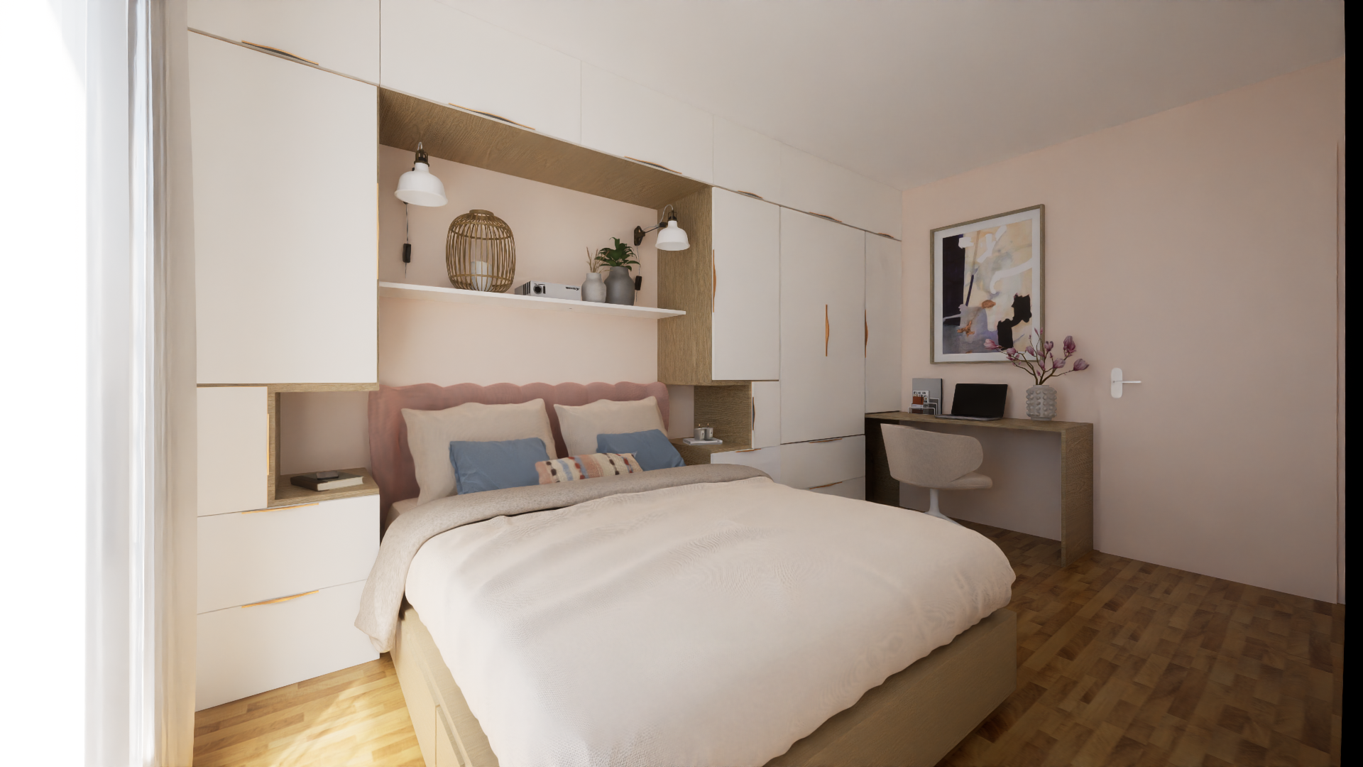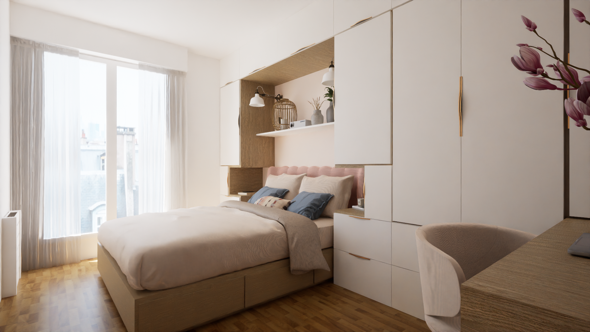 Dans la chambre, où aucun rangement n'était présent à l'origine, un dressing sur mesure a été conçu autour de la tête de lit, offrant une solution astucieuse et pratique. Un bureau a également été intégré, répondant aux besoins des occupants. L'ensemble a été pensé pour maximiser le confort et l'espace de rangement, tout en garantissant une utilisation fluide et fonctionnelle au quotidien. Cette approche sur mesure allie esthétisme et praticité, rendant l'appartement à la fois plus fonctionnel et chaleureux.
