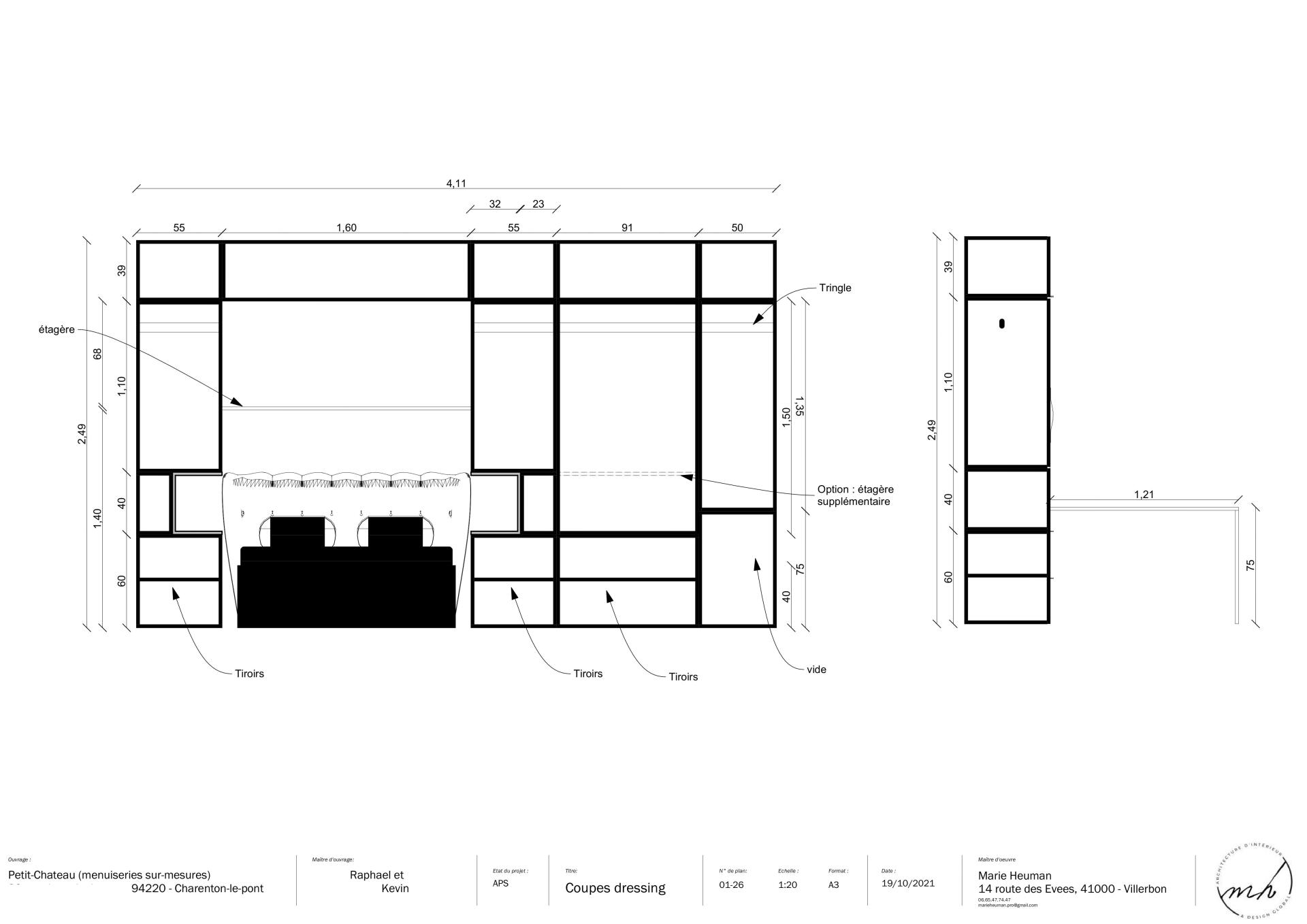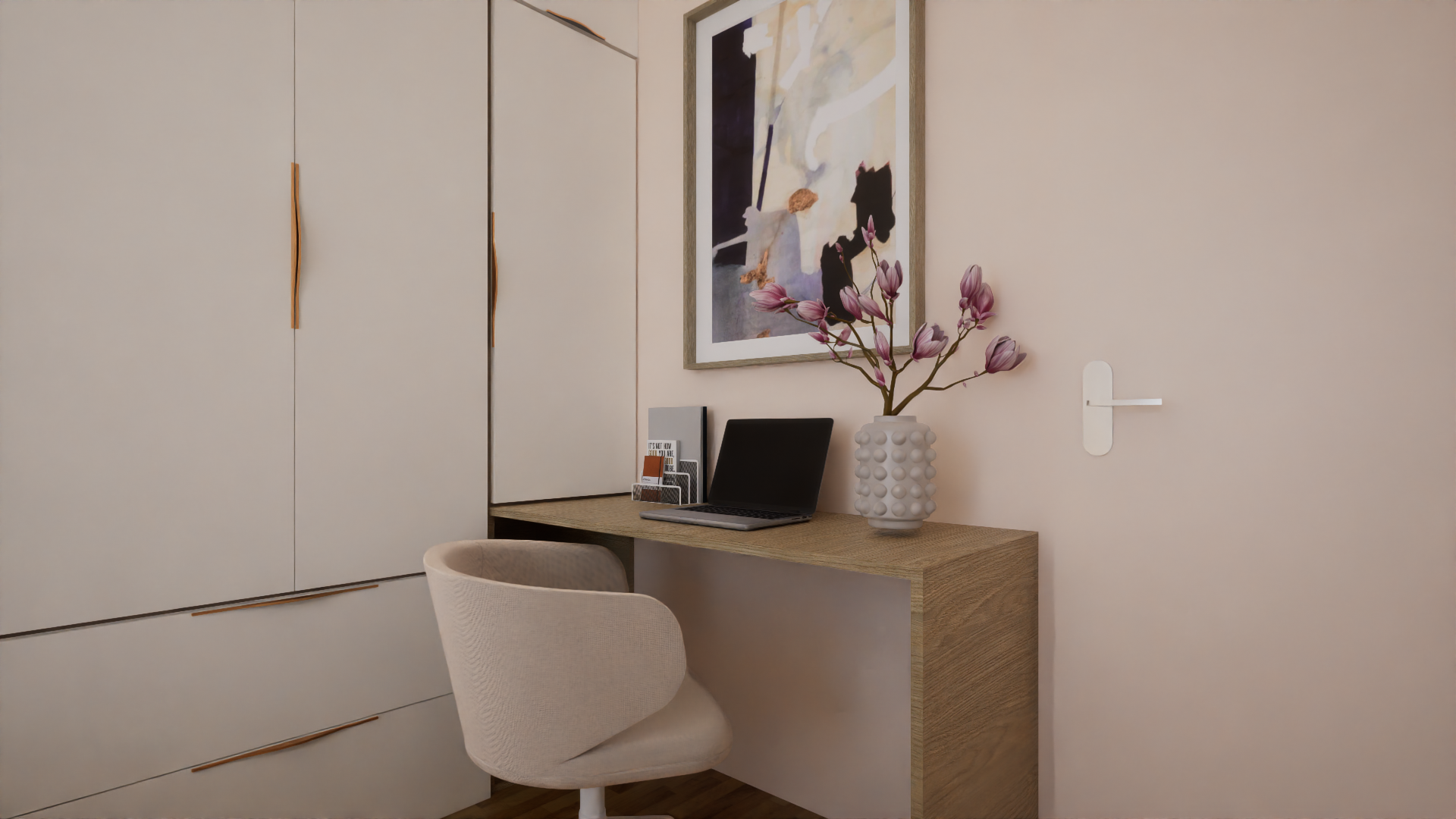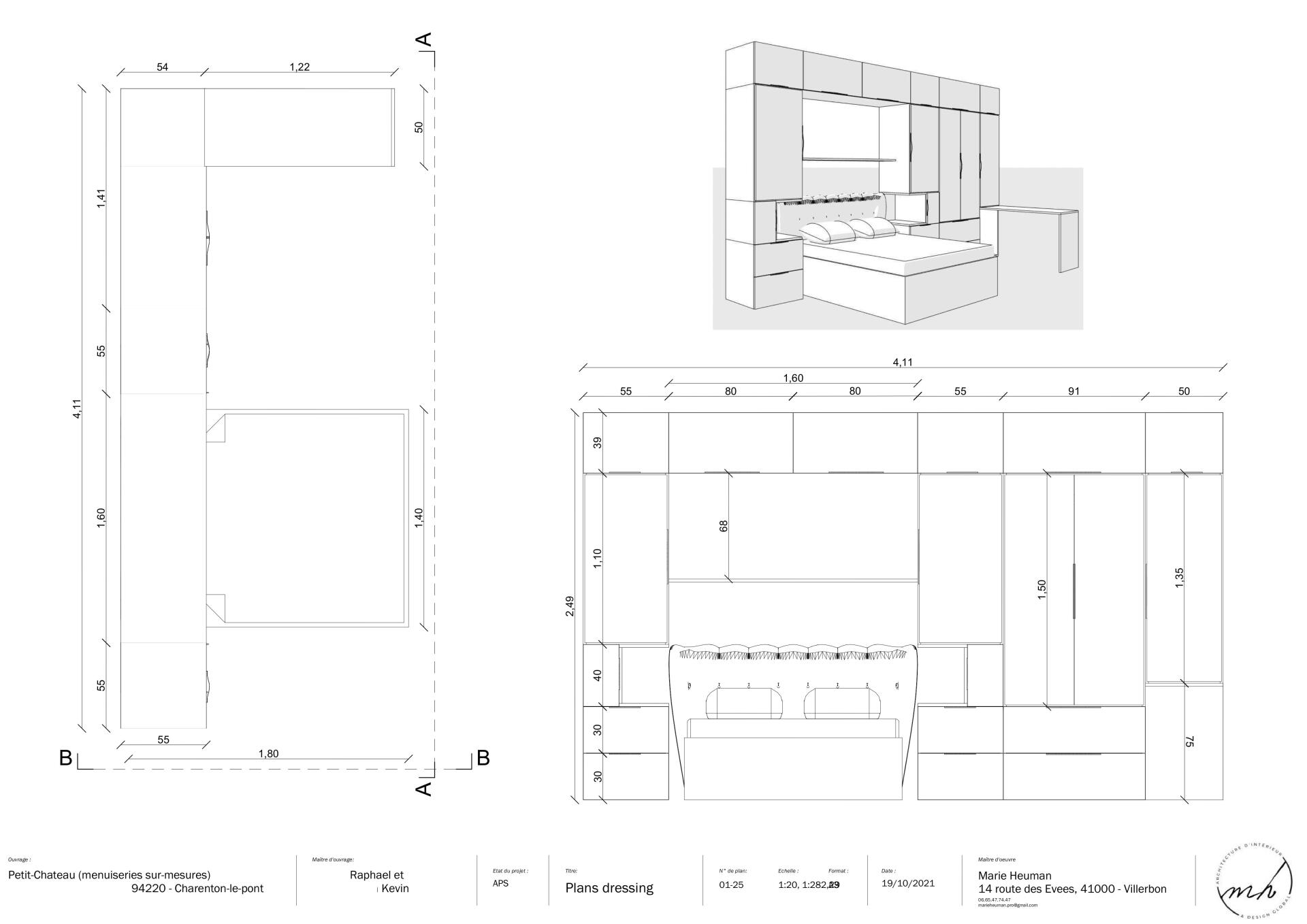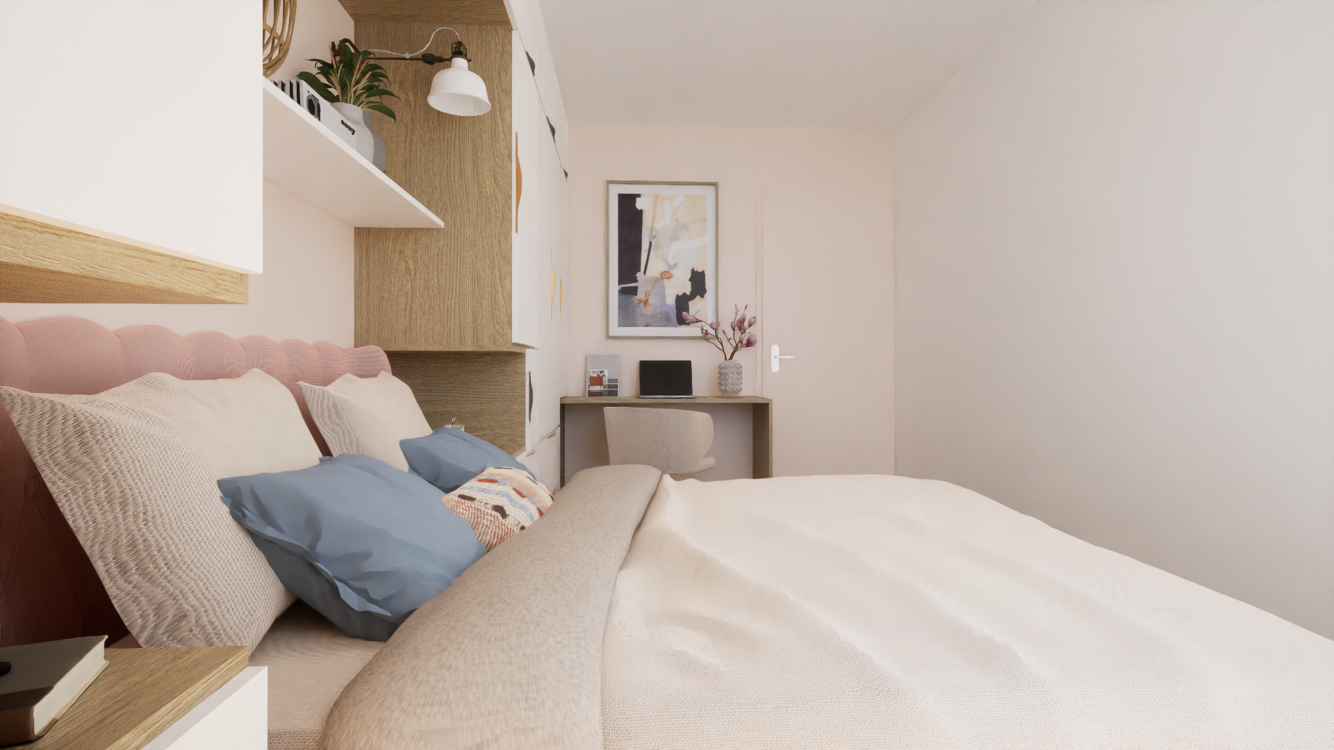 Dans la chambre, où aucun rangement n'était présent à l'origine, un dressing sur mesure a été conçu autour de la tête de lit, offrant une solution astucieuse et pratique. Un bureau a également été intégré, répondant aux besoins des occupants. L'ensemble a été pensé pour maximiser le confort et l'espace de rangement, tout en garantissant une utilisation fluide et fonctionnelle au quotidien. Cette approche sur mesure allie esthétisme et praticité, rendant l'appartement à la fois plus fonctionnel et chaleureux.
