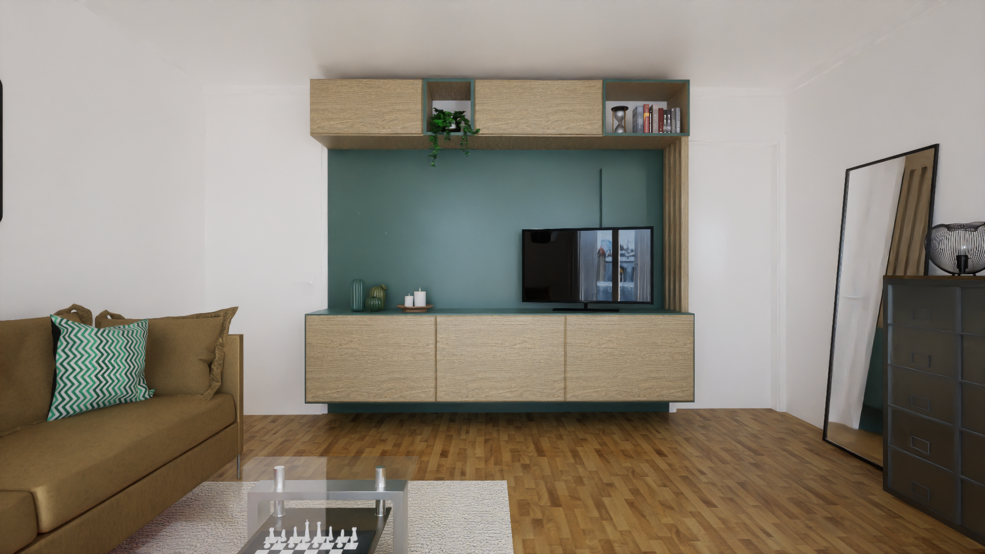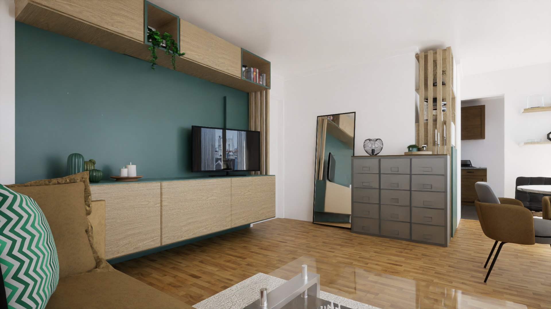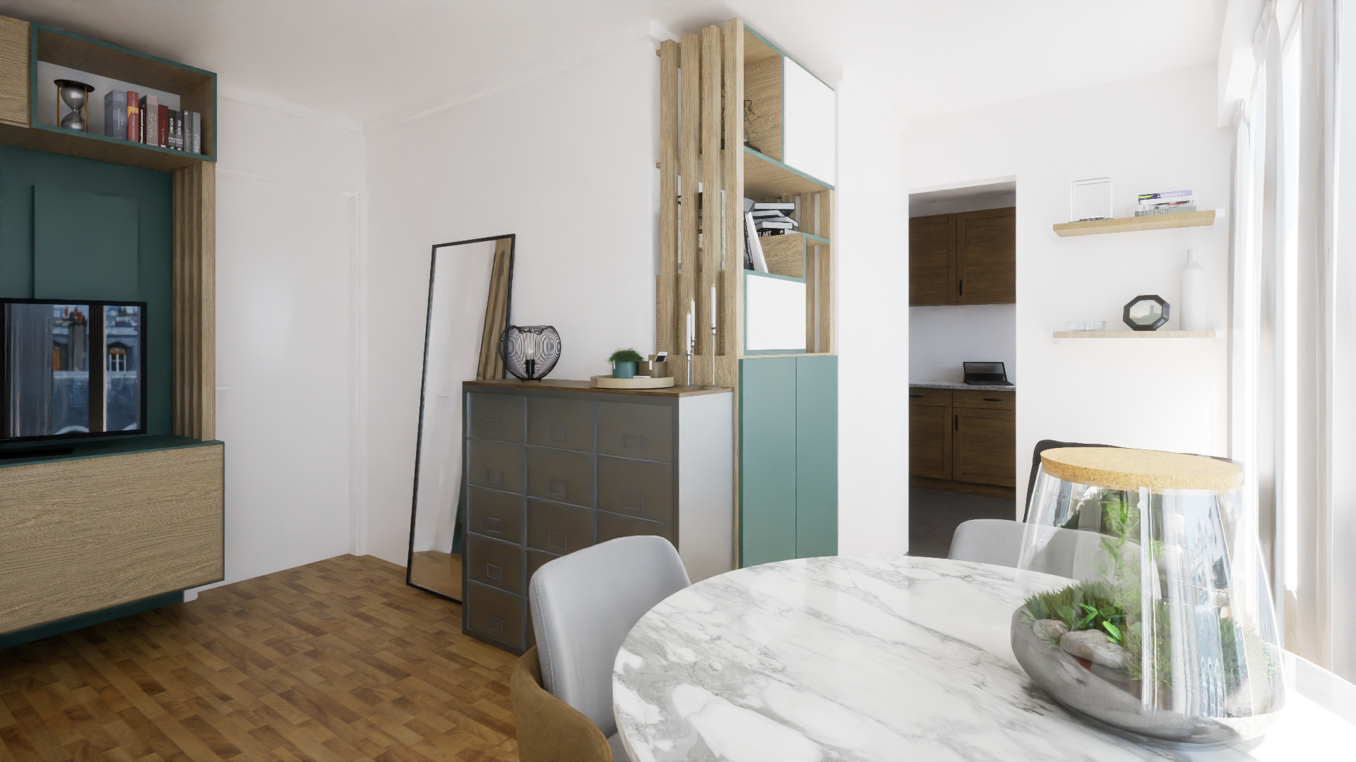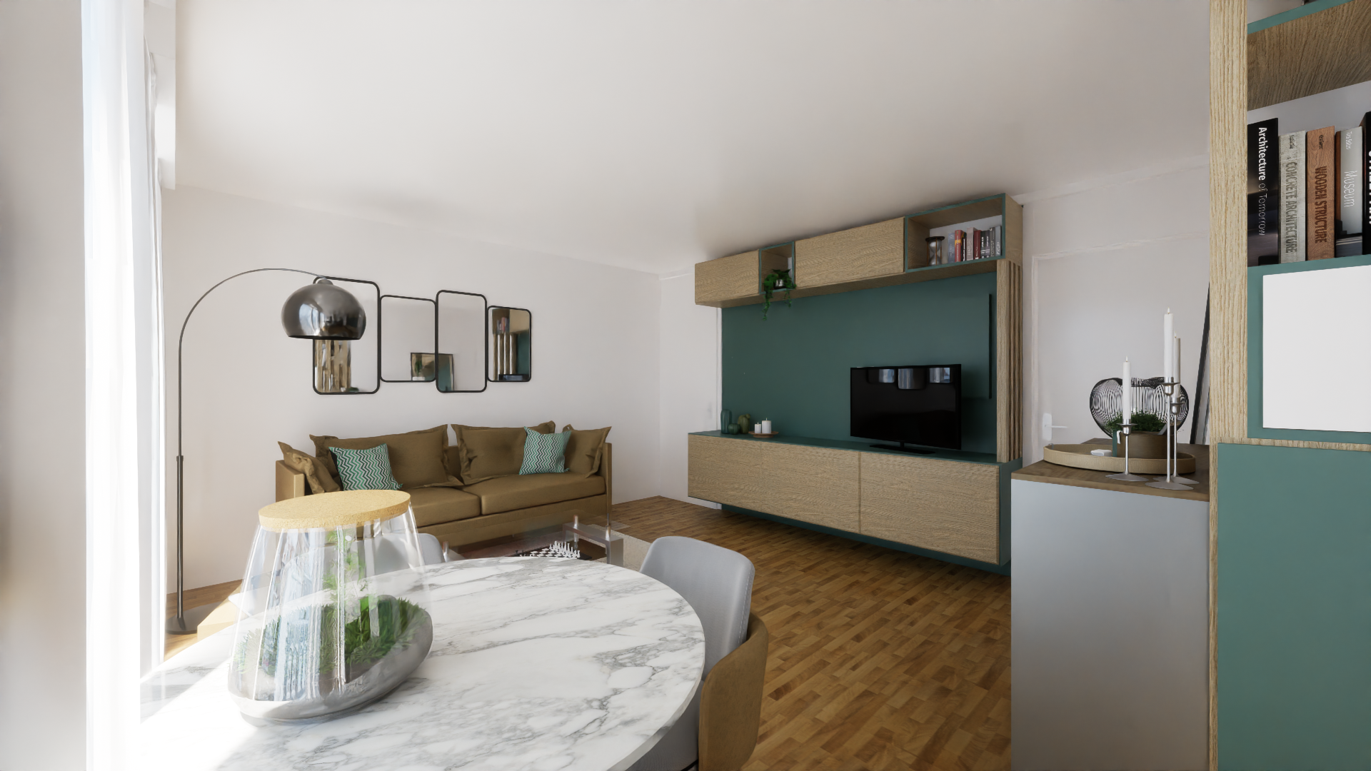 Dans le salon, un meuble TV intégré, accompagné d'une petite claustra, offre une séparation subtile avec l'entrée. Une bibliothèque a été dessinée sur mesure pour combler un espace mural peu exploitable, apportant à la fois des rangements supplémentaires et une petite penderie en partie basse. Le choix audacieux d'un vert profond contrasté avec les murs blancs, met en valeur les éléments centraux de la pièce et ajoute une certaine profondeur à l'espace. Associé au bois, il apporte à la fois chaleur et sophistication.