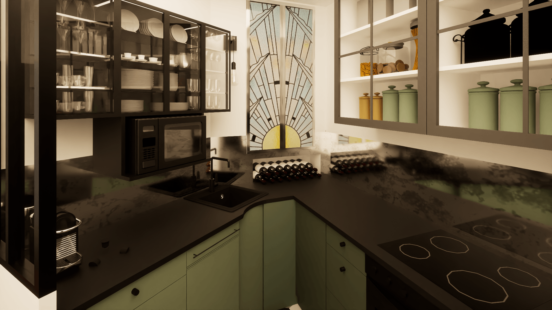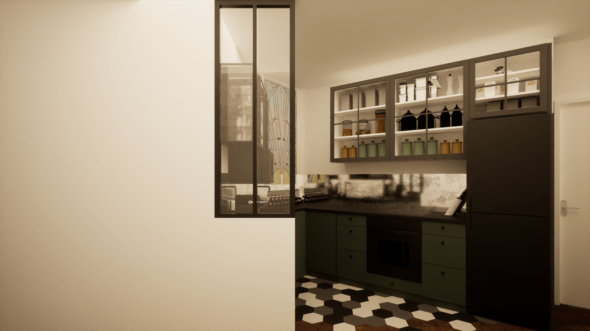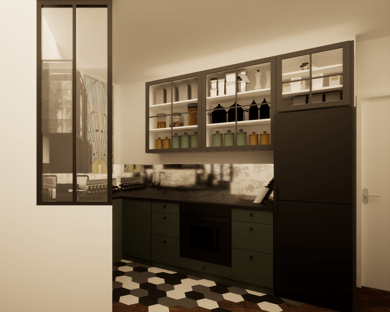 La cuisine a été ouverte davantage sur la pièce de vie. Une verrière a été installée pour délimiter visuellement l'espace tout en gardant de la luminosité. Les meubles hauts sont en verre également et jouent sur la transparence afin que la lumière les traverse. La faïence en miroir vieilli permet également de refléter la lumière. Au sol, carrelage et parquet viennent s'entremêler pour apporter une continuité des espaces.