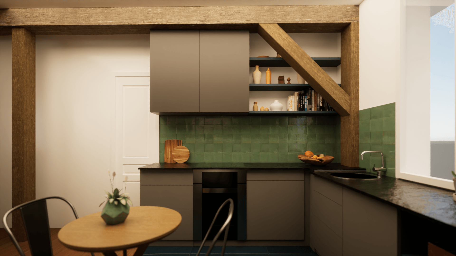 L'idée a donc été de réaménager la cuisine afin d'offrir plus de plan de travail, de la rendre mieux équipée et plus fonctionnelle. Pour cela, elle a été agrandie en empiétant sur la salle de bains.