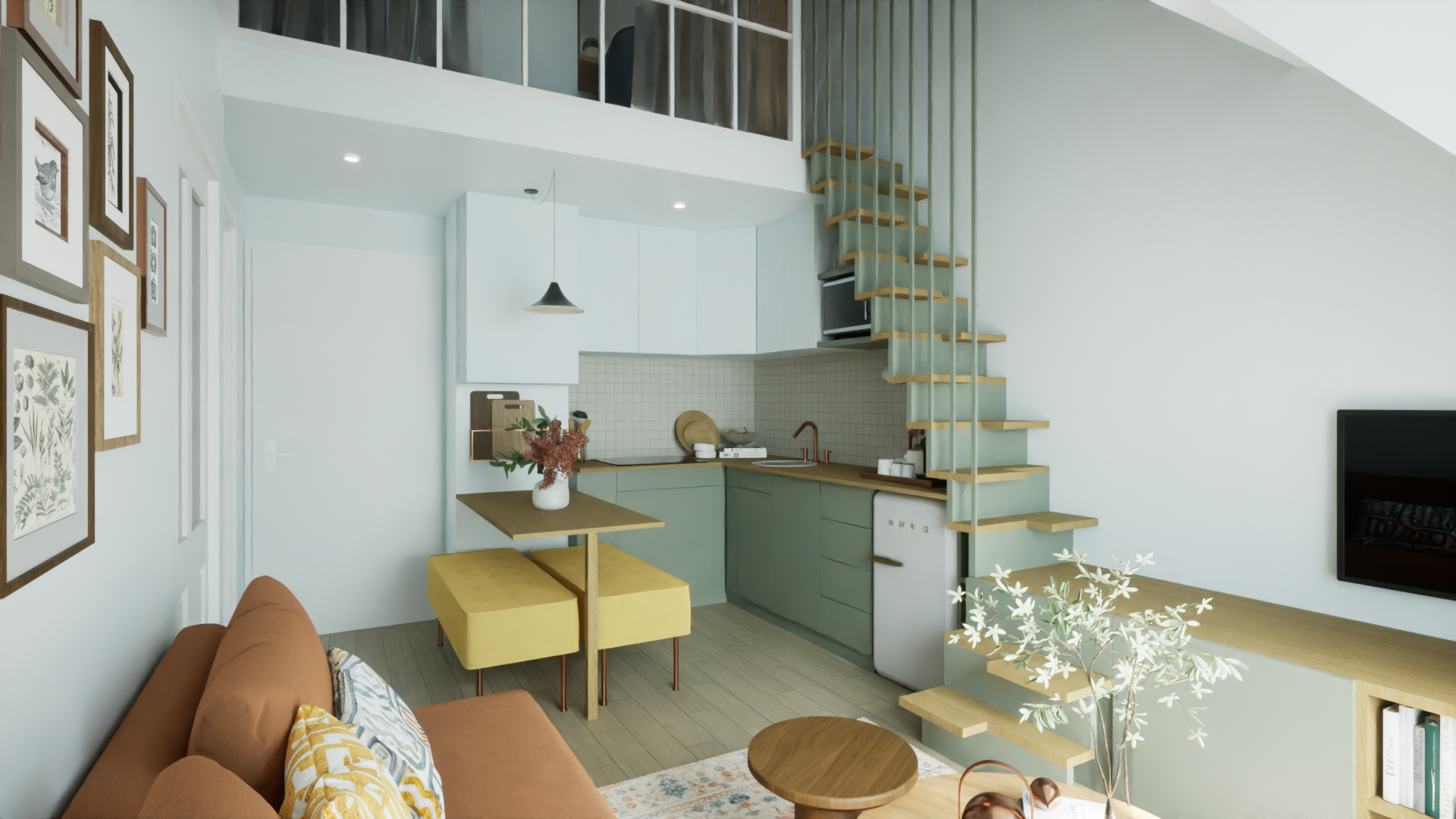 Dans l'espace de vie, le cloison de l'entrée a été supprimé afin d'agrandir la pièce et d'y intégrer une table à manger. La cuisine a été entièrement refaite pour devenir plus fonctionnelle et mieux équipée. L'escalier a été redessiné, se fondant harmonieusement avec un meuble TV sur mesure, créant ainsi du rangement supplémentaire tout en libérant de l'espace. Ce meuble-escalier est désormais un élément central de l'appartement, alliant esthétique et praticité.
