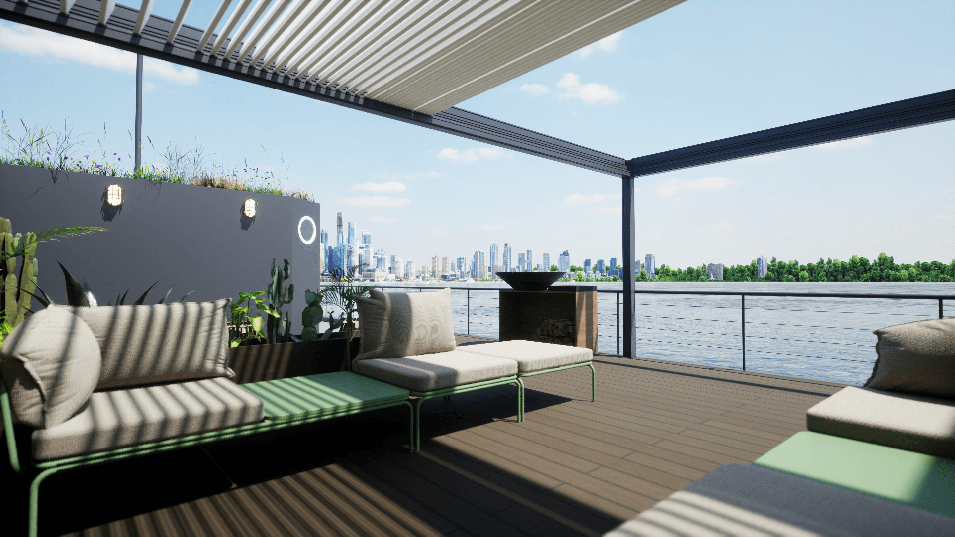 Une pergola bioclimatique recouvre partiellement la terrasse, permettant une utilisation optimale en toute saison. Grâce à ses lames de toit orientables, fonctionnelles et étanches, cette structure offre une grande flexibilité d'utilisation.