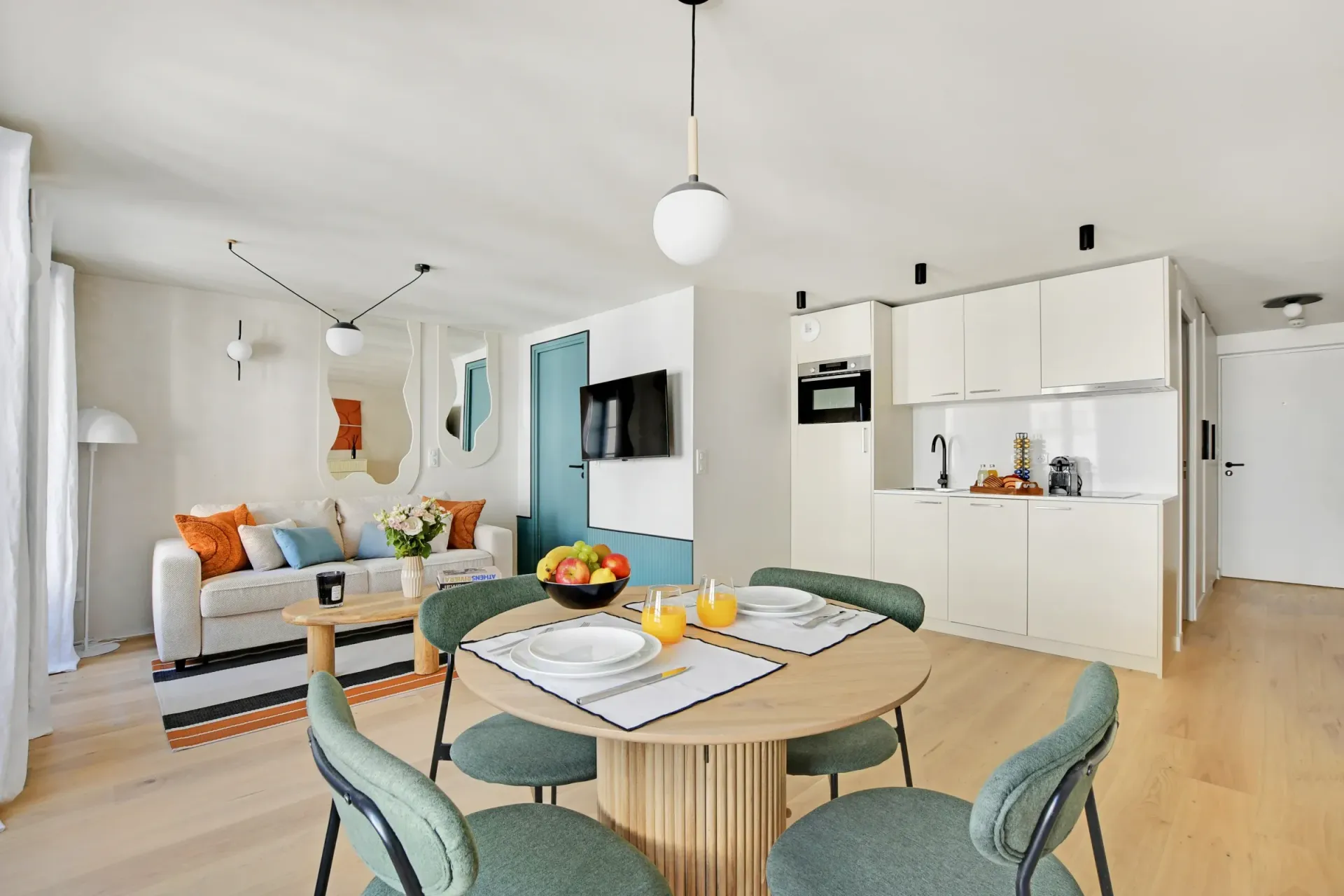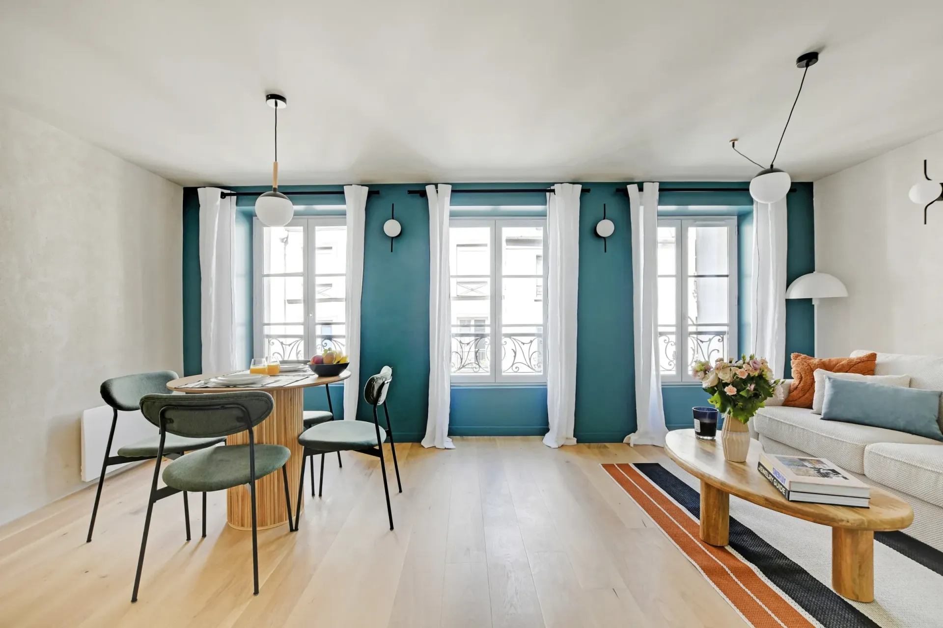 Ici retrouvez un des appartements de la typologie 1. Ce T2 lumineux donnant sur le passage du Grand Cerf offre tout le confort nécessaire pour passer un agréable séjour dans la Capitale.