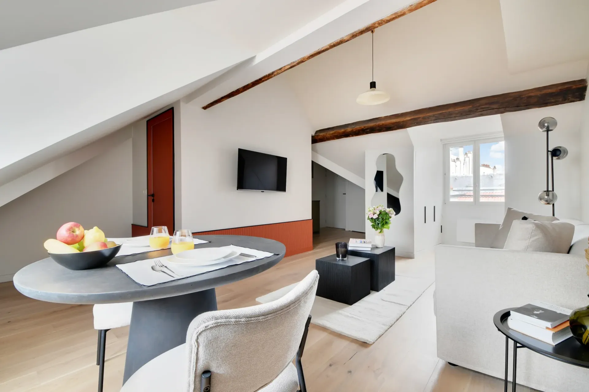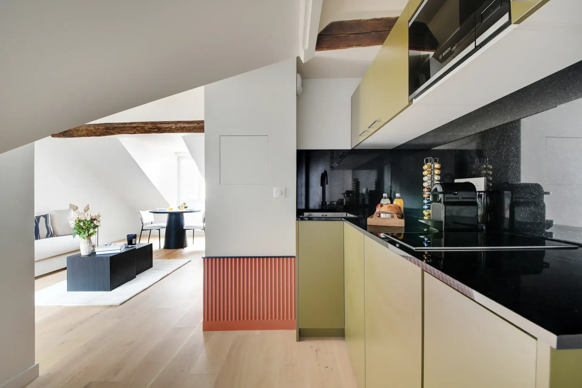 Ici retrouvez un des appartements de la typologie 2. Ce studio situé au dernier étage donnant sur la cour offre tout le confort nécessaire pour passer un agréable séjour dans la Capitale.