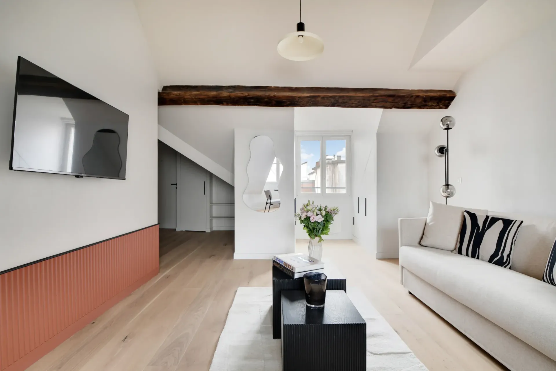 Située au cœur de la rue Saint-Denis dans le 2e arrondissement, l'immeuble est idéalement située. La rue Saint-Denis est l'une des plus anciennes rues de la ville : son axe est tracé dès le Ier siècle par les Romains. De ce constat, je me suis inspirée du style New Antique pour la rénovation. J'ai décliné ce style pour chaque typologie d'appartement afin d'avoir une cohérence dans le bâtiment tout en ayant des logements et une offre différente.