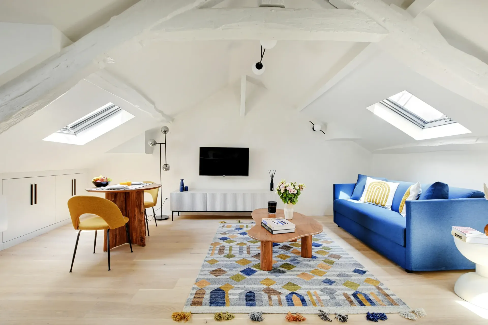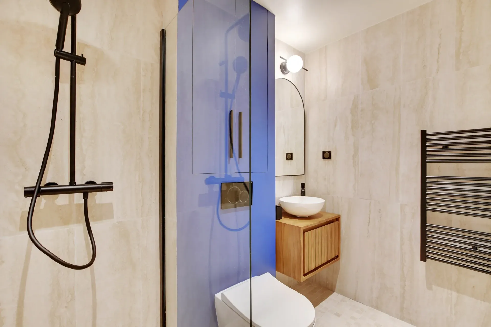 Ici retrouvez un des appartements de la typologie 4. Cet appartement parisien mêle avec élégance des éléments modernes et une palette de couleurs audacieuses pour un intérieur à la fois chaleureux et contemporain.