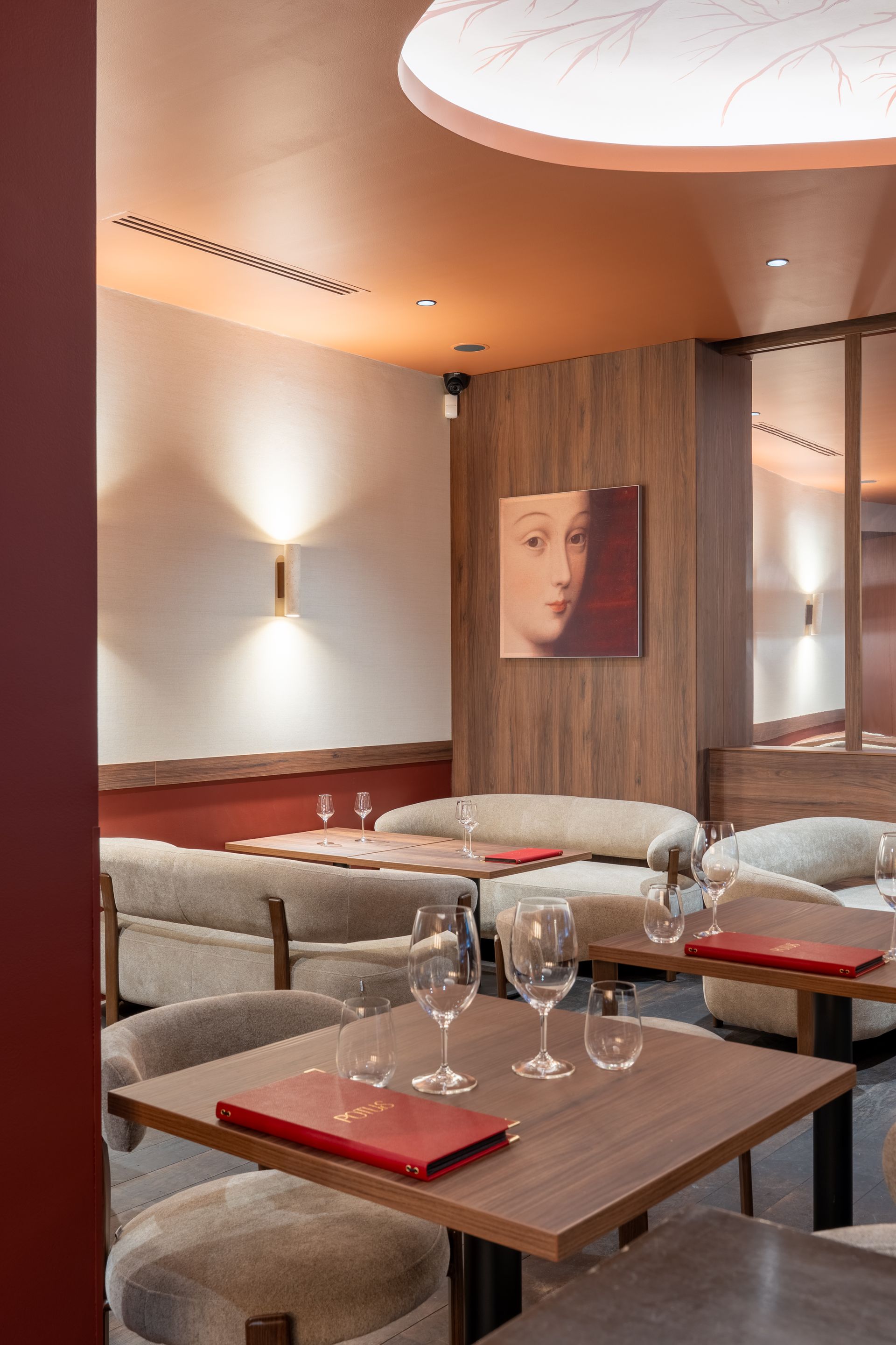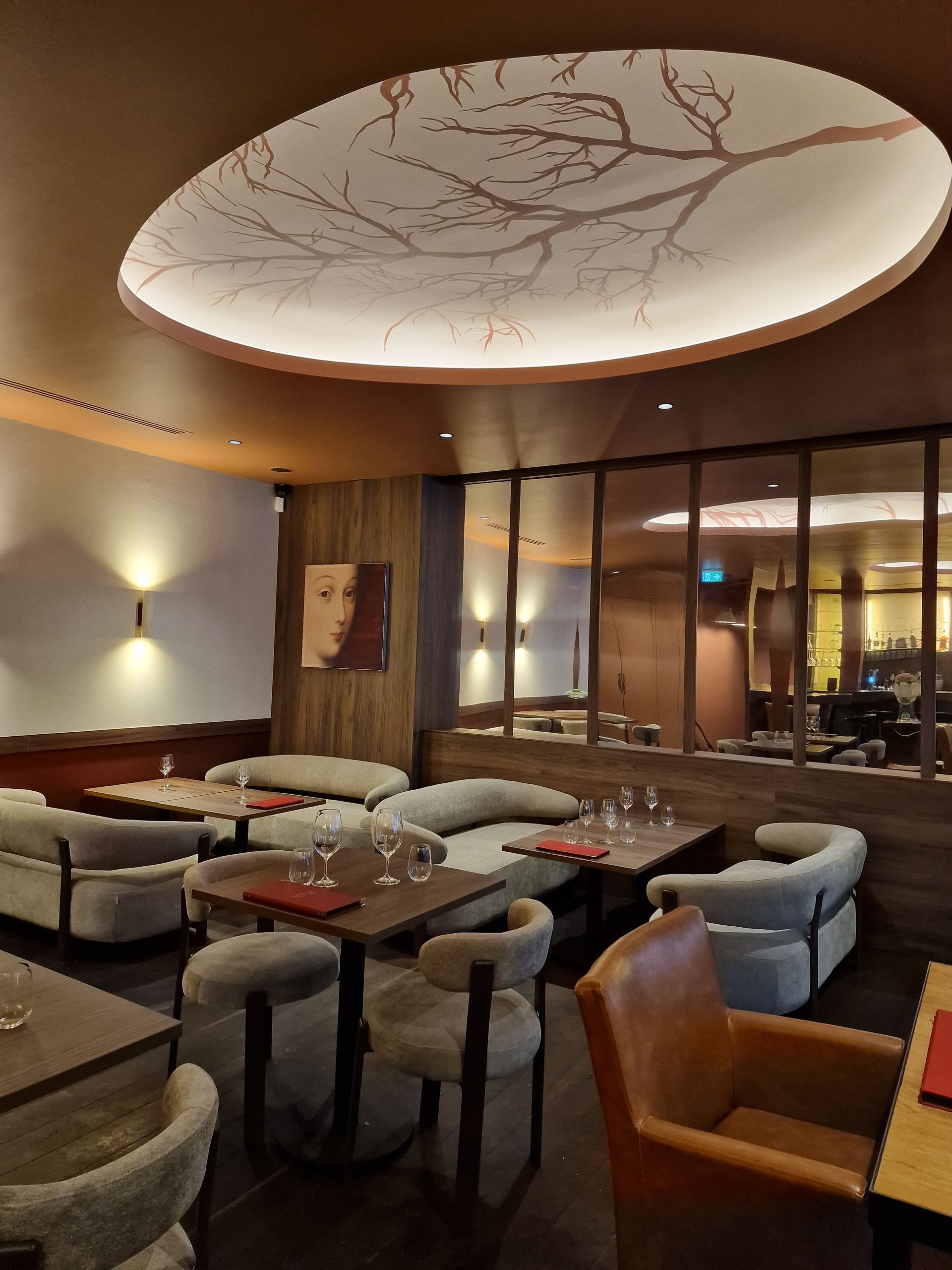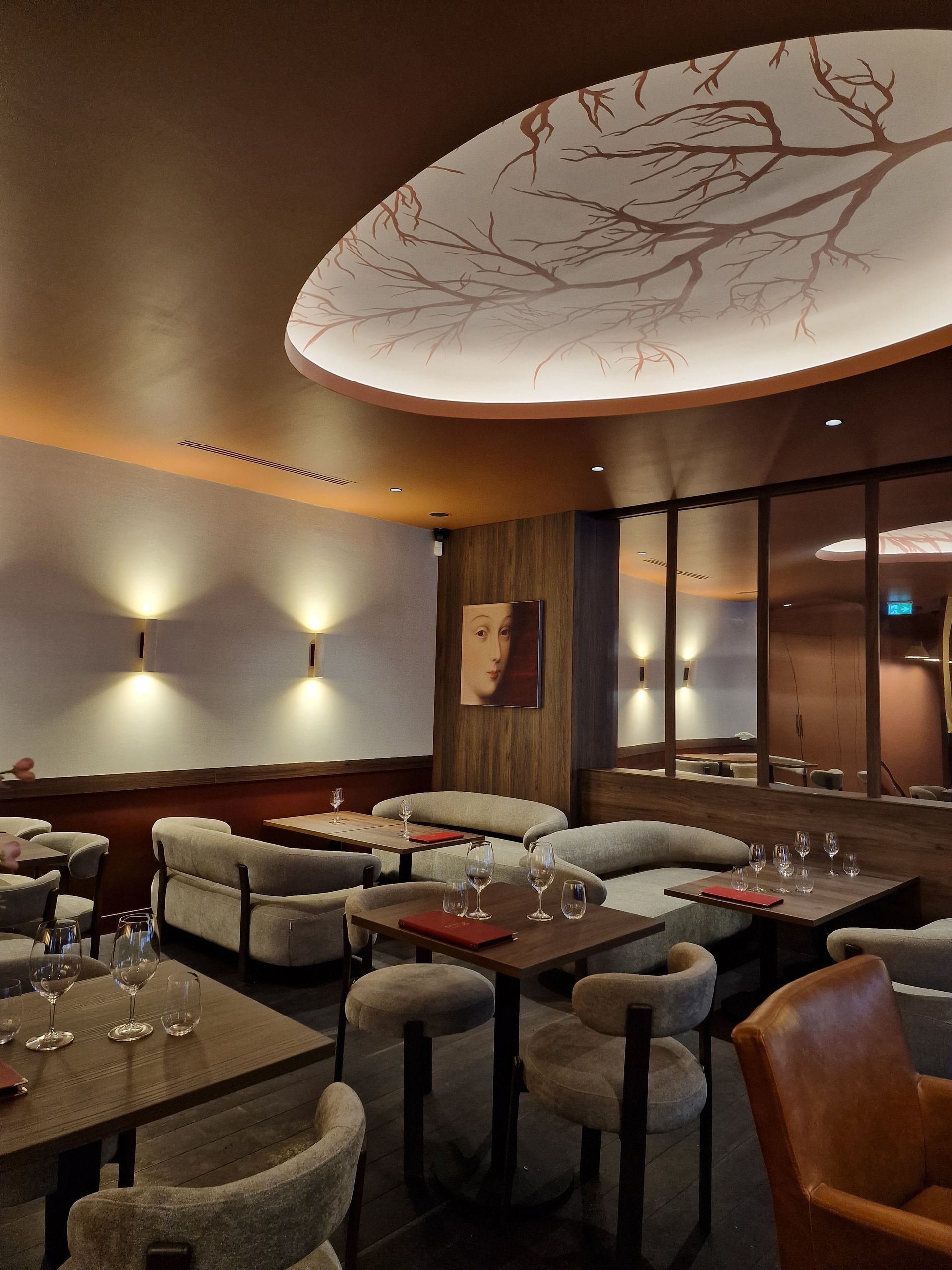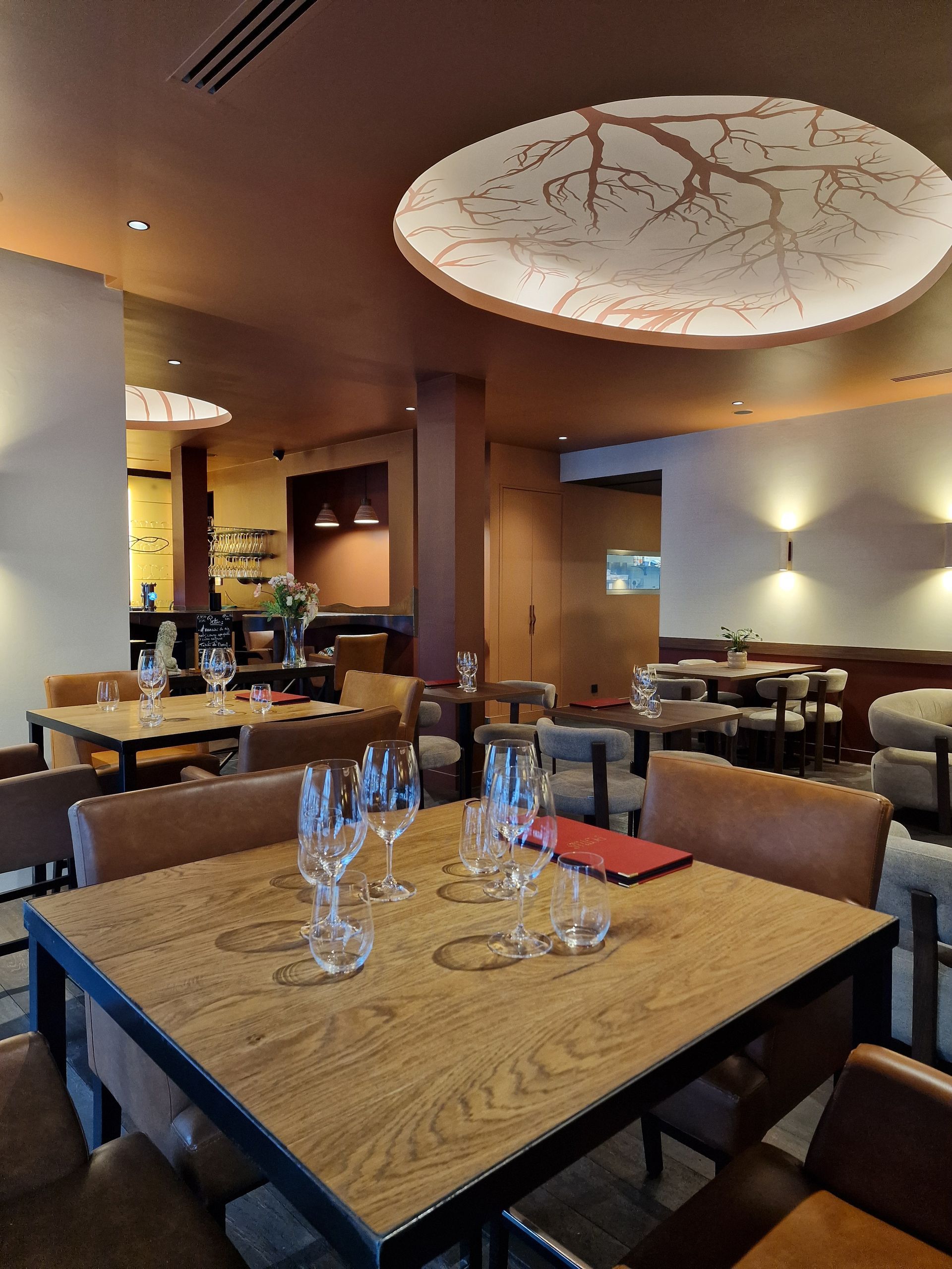 Au-dessus du bar, la sculpture en fer forgé évoquant les branchages de la vigne dialogue naturellement avec les fresques sur mesure des alcôves. Cette ramification devient un fil conducteur, un lien sensible entre les deux espaces.