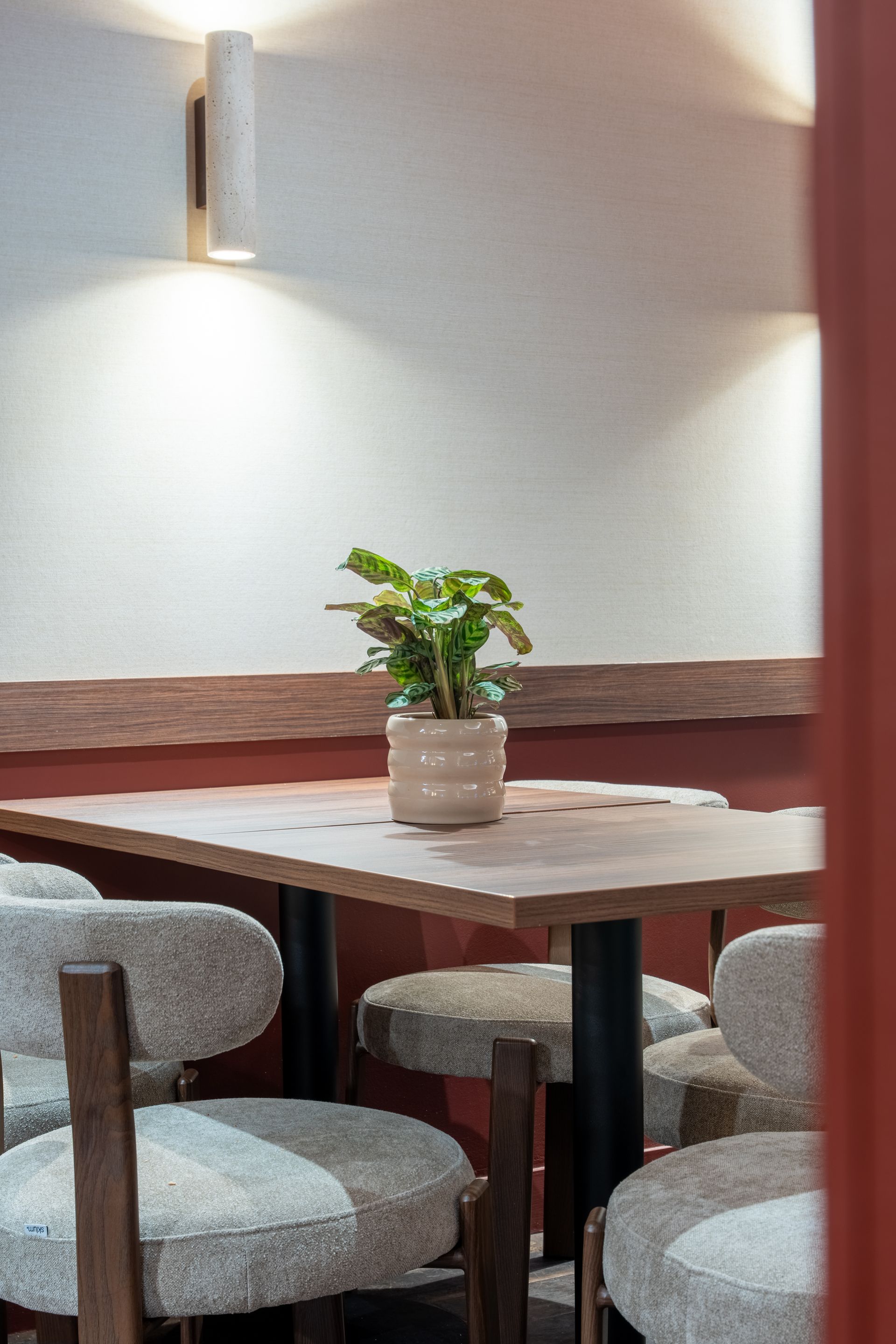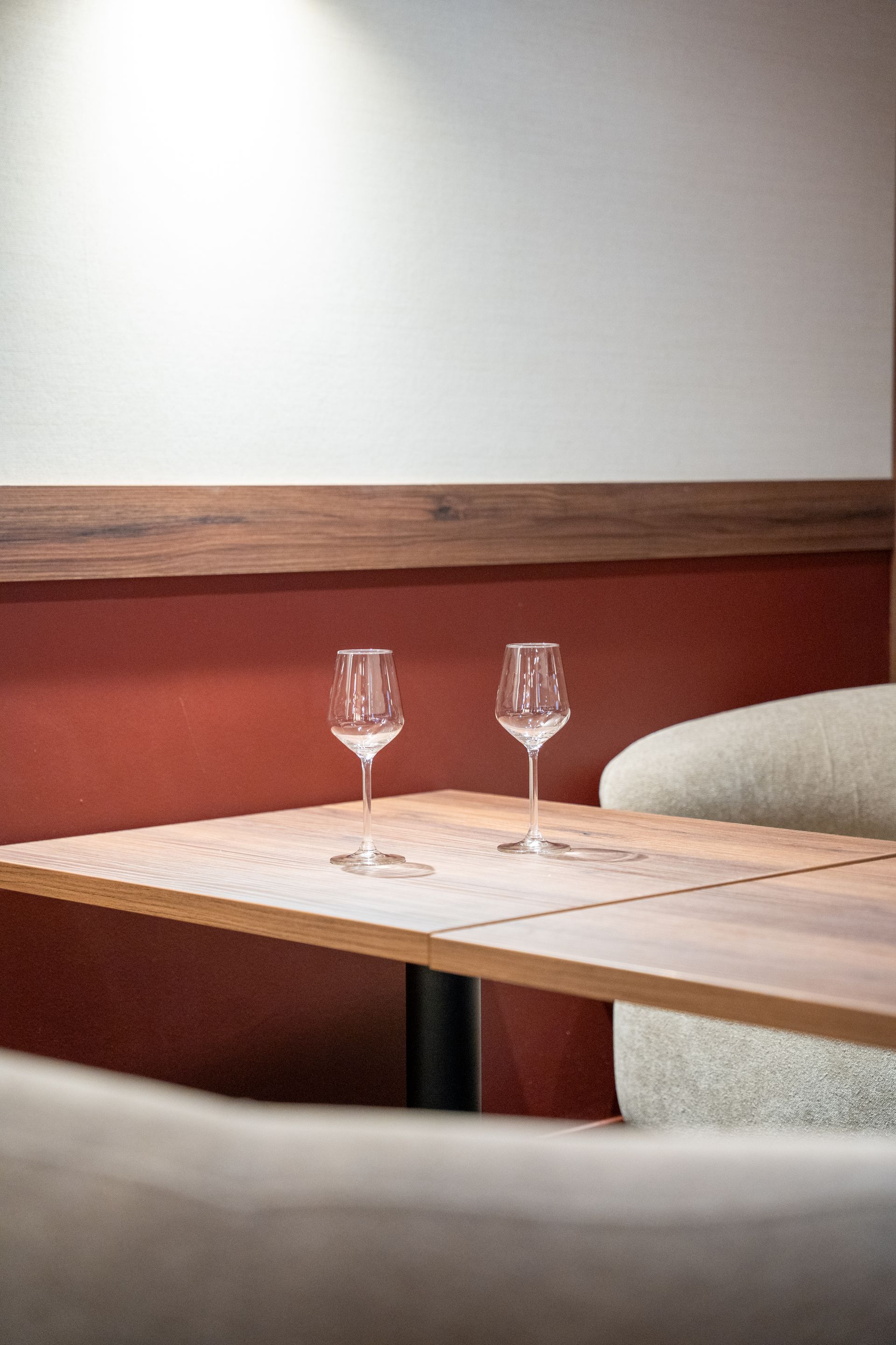 Dès l’analyse de l’existant, l’enjeu était clair : créer une ambiance chaleureuse et intimiste, sans rompre le dialogue avec la seconde salle. J’ai choisi de m’appuyer sur des nuances profondes de bordeaux et d’argile, en écho direct à l’univers du vin. Ces teintes structurent l’espace et installent une atmosphère tamisée, propice au partage et à la convivialité.