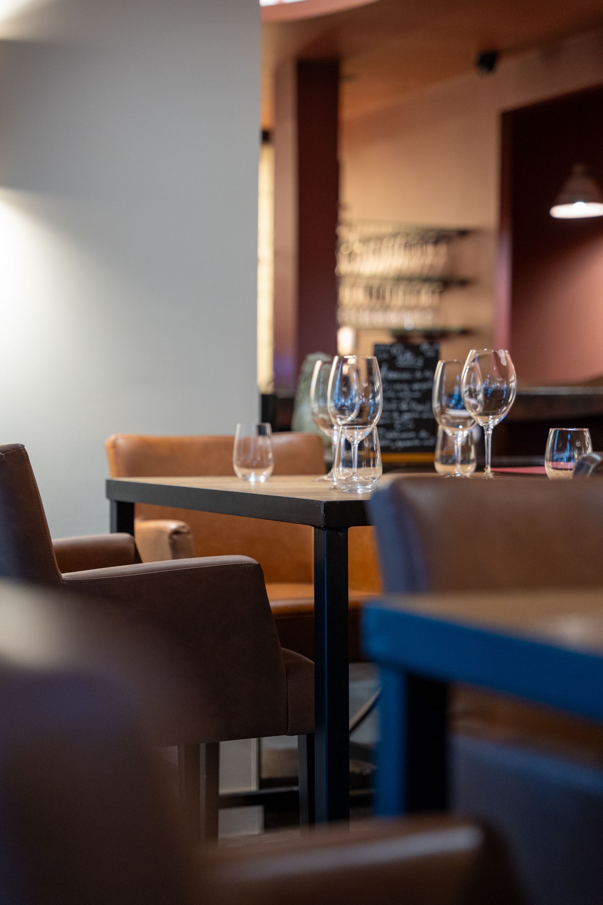 La diversité des usages a guidé la conception. Banquettes basses, tables classiques, tables hautes : les assises se multiplient pour accompagner les différents moments de la soirée, de l’apéritif informel à la dégustation plus posée. Le comptoir en fer forgé existant, réalisé par un artiste, s’est imposé comme une pièce maîtresse. Conservé et valorisé, il ancre le lieu dans une histoire et une matière brute, authentique.