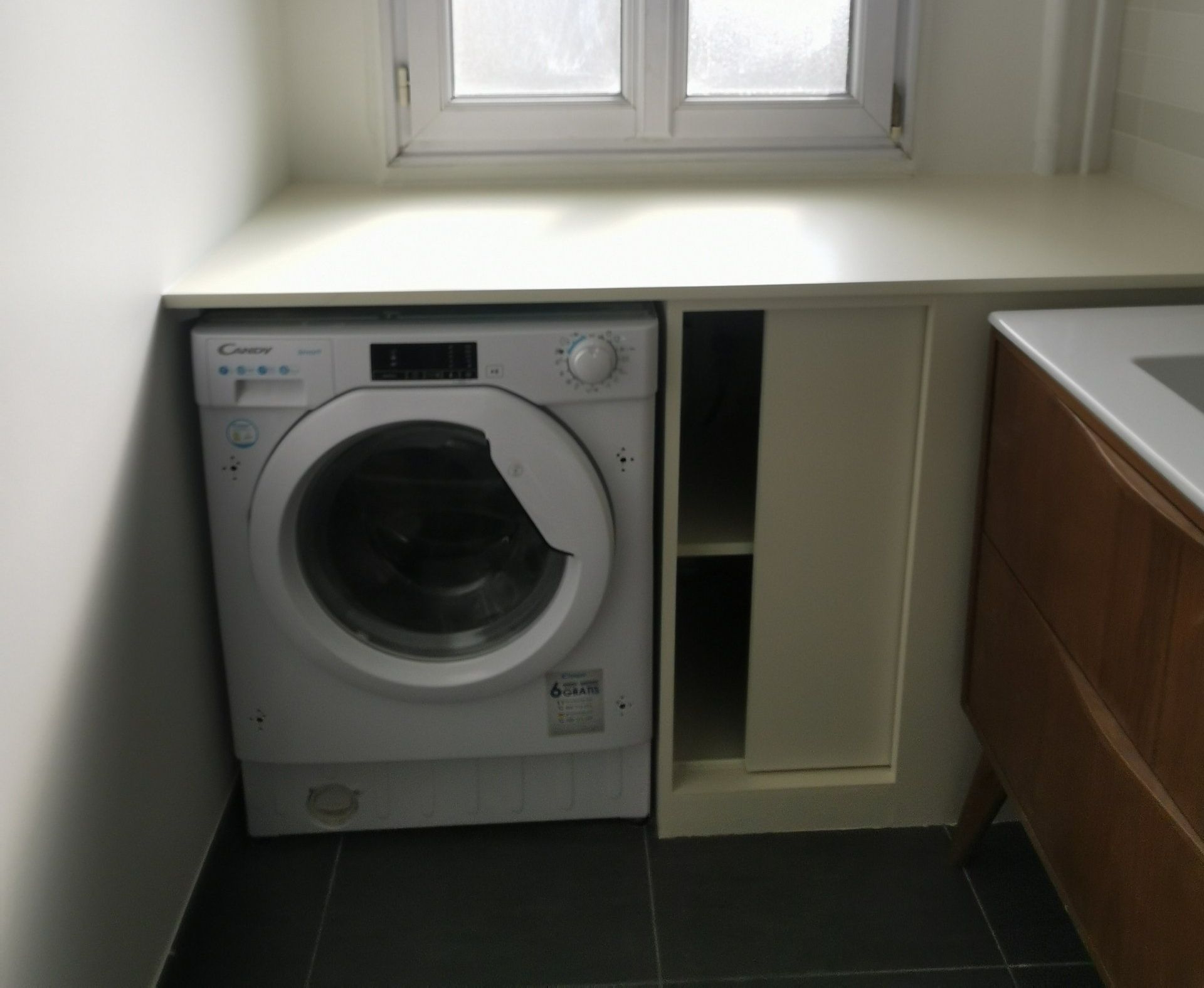 Enfin, la salle de bains a été réaménagée pour conjuguer confort et praticité. Un meuble sur mesure sous la fenêtre accueille astucieusement la machine à laver tout en offrant des espaces de rangement.