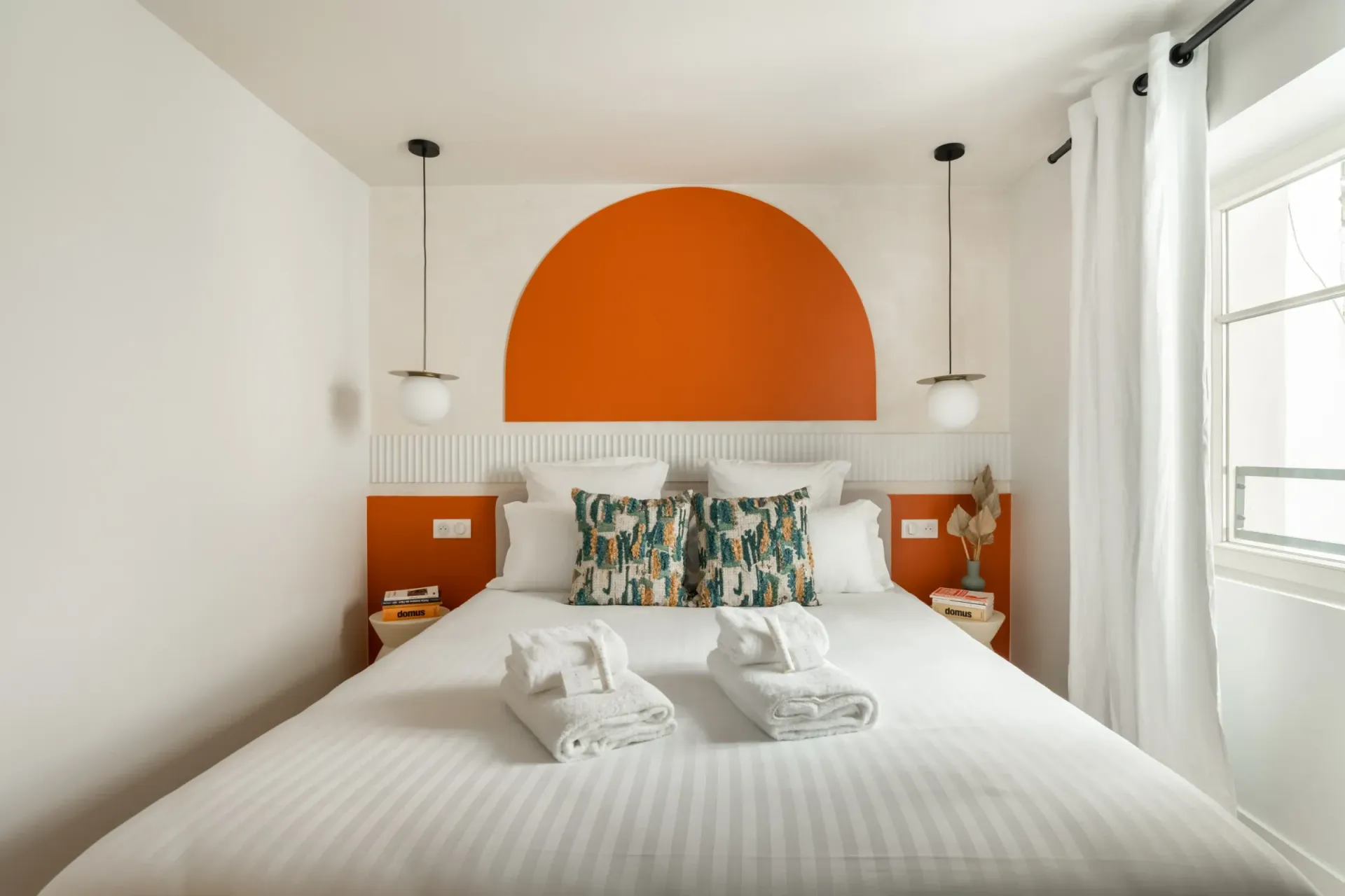 Prenons par exemple un des appartements typologie 1, un lumineux T2 donnant sur le passage du Grand Cerf. Ce lieu a été conçu pour offrir à ses futurs occupants une expérience agréable au cœur de la capitale. Les teintes choisies sont douces et enveloppantes, un bleu turquoise/pétrole calme et rafraîchissant, ponctué de touches chaleureuses d’orange et de corail. Ce mariage de couleurs crée une atmosphère à la fois apaisante et vivifiante, idéale pour se détendre après une journée dans le tumulte parisien.