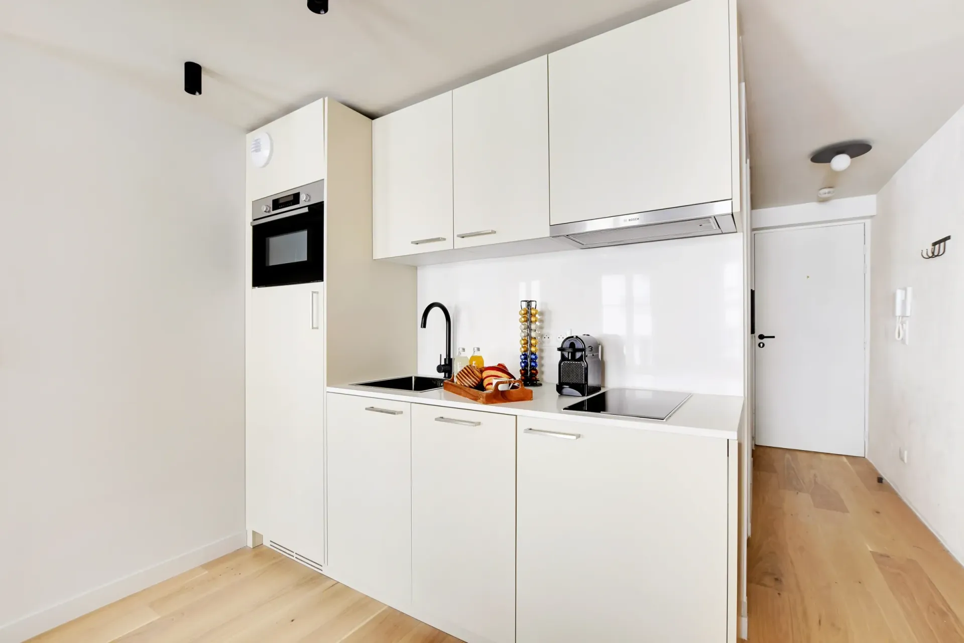 L’agencement a été pensé pour maximiser l’espace et offrir un confort optimal : un coin salon avec canapé invite à la détente, tandis que la cuisine ouverte, adjacente à l’espace repas, permet de savourer des moments conviviaux. La salle de bains, équipée d’une douche à l’italienne et de WC, se pare de travertin conservant l’esprit du New Antique. La chambre, calme et intime, sur cour, dispose d’un lit double et d’un placard fonctionnel, créant un lieu de repos parfait.