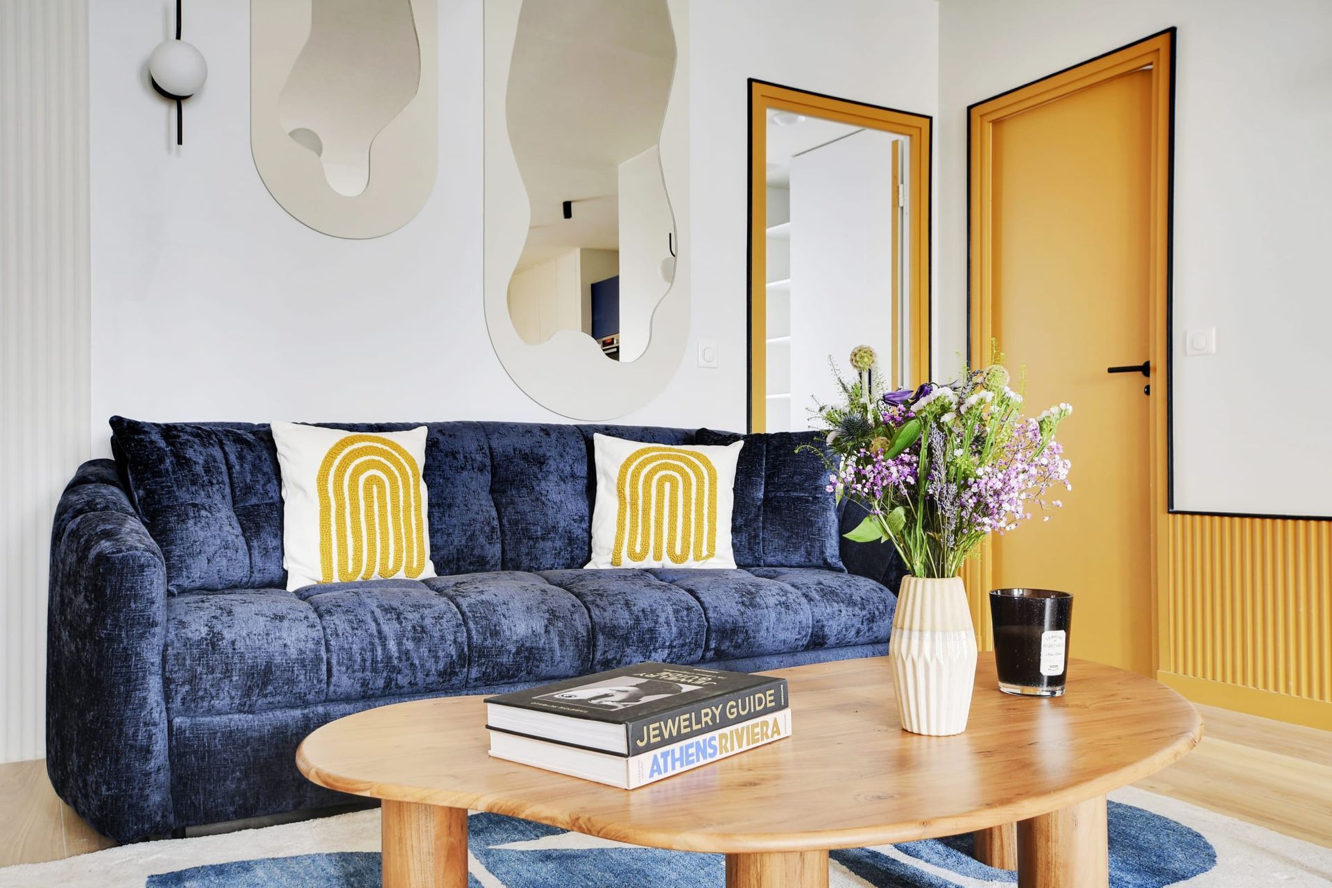 Dans le calme de la cour intérieure, cet appartement T2, destiné à la location saisonnière, offre un havre de paix où se mêlent confort moderne et touches de caractère. Ici, l’harmonie des teintes ocre, bleu et beige crée une ambiance chaleureuse et apaisante, invitant à la détente tout en mettant en valeur chaque élément de l’espace.